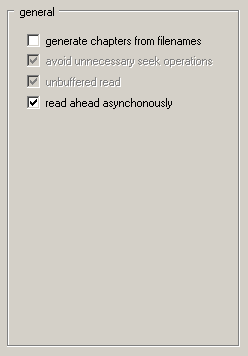 | read ahead asynchronously | AVI-Mux GUI operates on pieces of 512 kB. Unless caching itself is disabled, AVI-Mux GUI will access files only in such pieces. When this setting is enabled, accessing one such piece of a file will immediately initiate reading the next piece, so that, when it is required, it is already loaded, or at least, loading is already in progress, so that it takes less time. This setting was implicitely activated if and only if "unbuffered read" was activated in versions prior to 1.17.4. This setting should be disabled if and only if it leads to problems, as it makes AVI-Mux GUI slower. |
