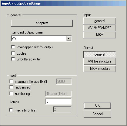 | maximum file size - advanced | You can enter time stamps where a new file should be created. Chapter markers can also be used. The syntax for time stamps is the same as in the chapter menu (h:min[:sec[.frac]] or [hh][mm][ss[ms]), and for chapters, type chapter n or, for subchapters, chapter i1.i2.....ik. Type chapter * to set a split point for each chapter, type chapter *.* to make a split point per chapter and subchapter and so on. |