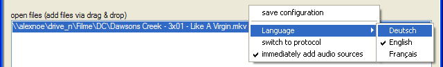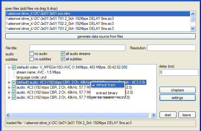 | save configuration | Saves a skript file which allows to restore the current state of the program, including all settings, all open files, all selected video sources, audio sources and subtitle streams, names and delays of streams. Beginning with v1.17.5, restoring file and stream order is supposed to work correctly. When there are chapters, and additional chapter xml file will be created. The amg file will load this chapter file. |